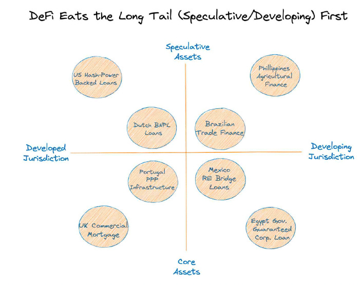 To pinpoint the ideal target markets for tokenised RWAs, it is important to step back and identify where DeFi has made the most impact. And no, it’s not in helping degens lever up and ape into a million shitcoins. It’s been on the underserved in emerging economies, who have been able to gain access to USD-denominated stablecoins and store their savings in currencies that do not frequently lose value. Most of this access has been targeted towards retail users, but there is high potential for businesses and SMEs in the developing world to benefit from a wider variety of financing options. Referring back to Jason Chen’s Unreal Primer, the right hand side of the below graph represents the markets that are most appropriate for RWAs: