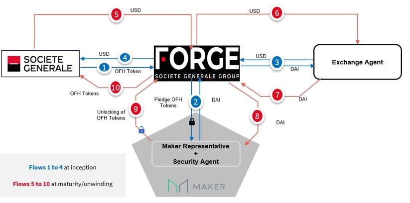 First, SocGen transferred ownership of the OFH bonds to SG-Forge, which pledged the tokens into MakerDAO as collateral. In return, SG-Forge borrowed DAI, swapped it into fiat via an exchange agent, and transferred the fiat to SocGen. The unwinding process works the other way – SocGen transfers fiat to SG-Forge, which converts it into DAI via an exchange agent, deposits the DAI into MakerDAO, unlocks the OFH tokens, and transfers them back to SocGen.